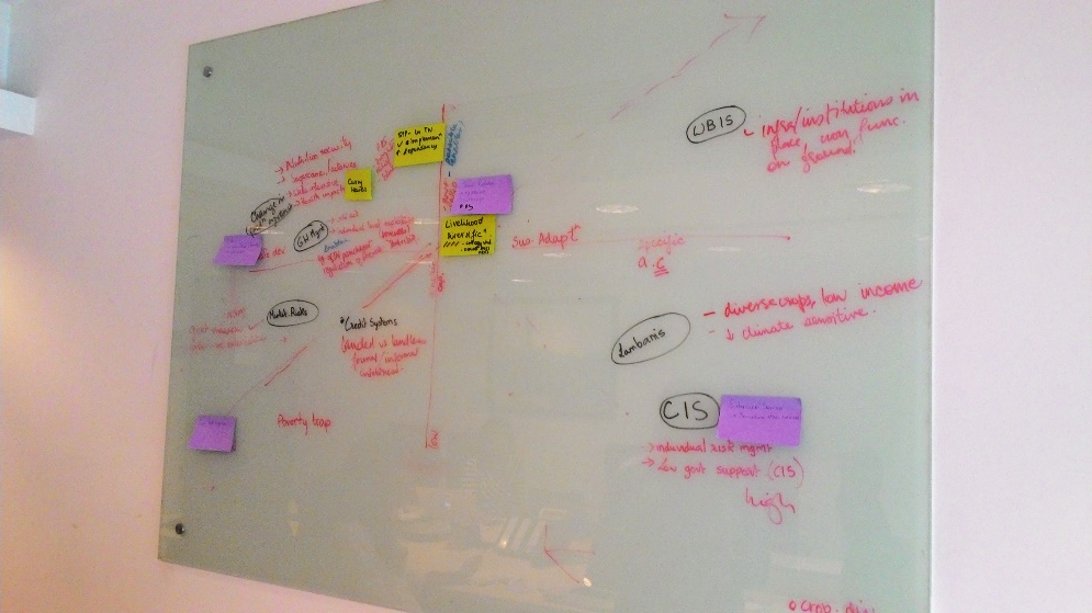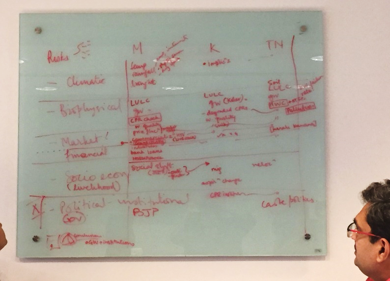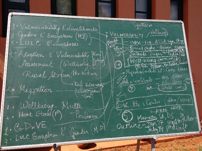 And then we were back in our offices. Our daily life of deadlines sucked us in completely and those eager blackboard jottings lay undisturbed. In June, Amir Bazaz (Research Lead, India Team) asked us to revisit pictures from those blackboards and take stock of our synthesis outputs. Retrospect and a relook at ASSAR’s framing questions (of scaling, barriers and enablers, and effective adaptation) helped us shorten the initial wish list and we ended up with two key areas of synthesis: drivers of vulnerability and barriers and enablers to adaptation in semi-arid India; and examining vulnerability through a wellbeing lens. A few emails later, we set up smaller working groups with people self-selecting into the teams based on interest, familiarity with the data, and available time. Outlines were drawn up, initial thoughts put down. Things were moving!